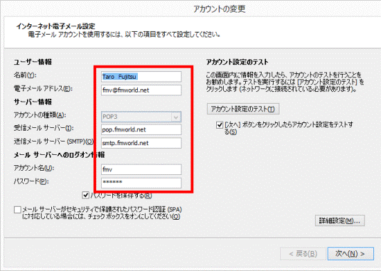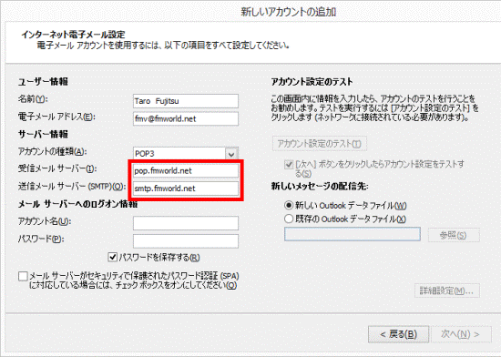 「受信メールサーバー」と「送信メールサーバー」欄に、メールサーバーを入力します。