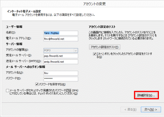 - 接続方法や、サーバーなどを詳細に設定する場合は、「詳細設定」ボタンをクリックします。