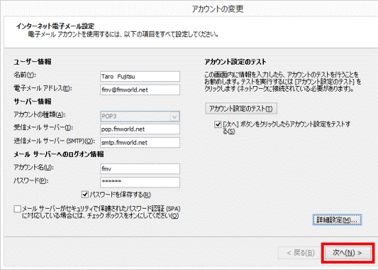 - 設定の変更が終わったら、「次へ」ボタンをクリックします。