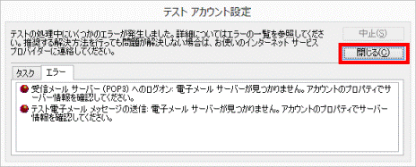 「テストアカウント設定」でエラーが表示された場合は、「閉じる」ボタンをクリックします。