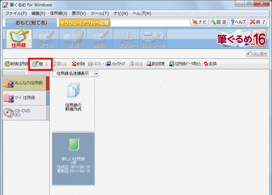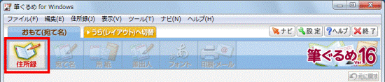 「うら(レイアウト)」が表示されているときは、「おもて(宛て名)へ切替」タブをクリックします。 - 「住所録」ボタンをクリックします。