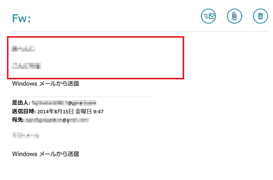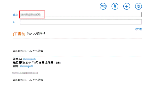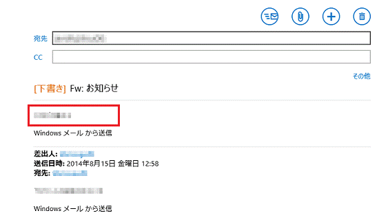 メールの件名に「FW:」が付き、本文中にメールの引用が表示されていることを確認します。