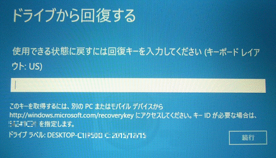 ただし、デバイスの暗号化を有効のまま、リカバリを実行すると、回復キーの入力を求められます。
