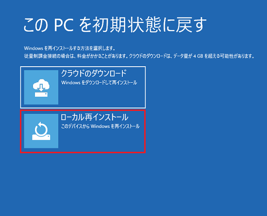 Windowsを再インストールする方法を選択する手順では、必ず「ローカル再インストール」を選択してください。