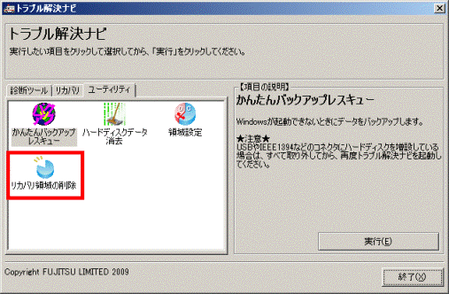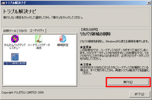 2009年冬モデルのFMV-BIBLO LOOX C / LOOX Mシリーズは、リカバリ領域を削除するとリカバリができなくなります。削除しないでください。