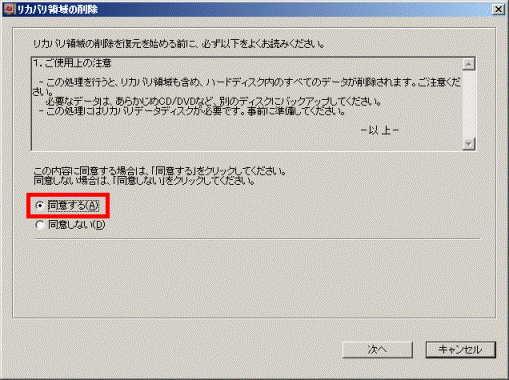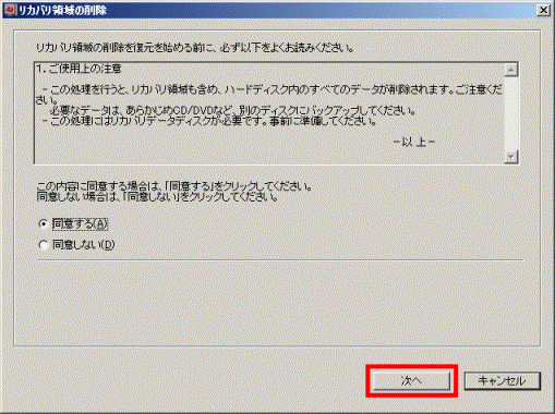 - 「リカバリ領域の削除を復元を始める前に、必ず以下をよくお読みください。」と表示されます。