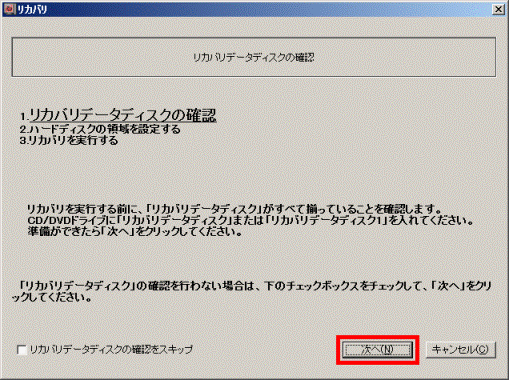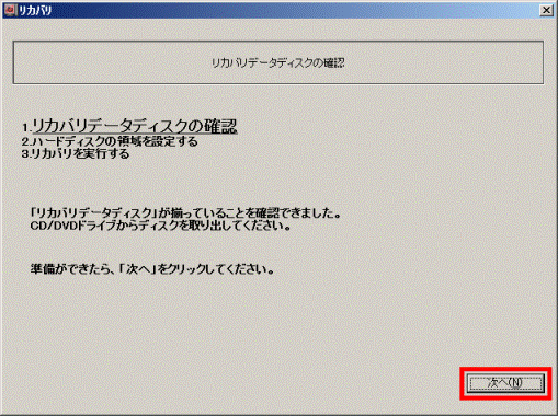 「トラブル解決ナビ&ソフトウェアディスク1」を取り出し、「リカバリデータディスク1」をセットして、「次へ」ボタンをクリックします。