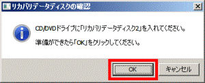 「リカバリデータディスク1」を取り出し、「リカバリデータディスク2」をセットして、「OK」ボタンをクリックします。