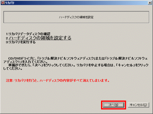 「リカバリデータディスク2」を取り出し、「画面で見るマニュアル」をセットして、「次へ」ボタンをクリックします。 - 「Cドライブにデータを復元しています。」と表示されて、リカバリが再開されます。