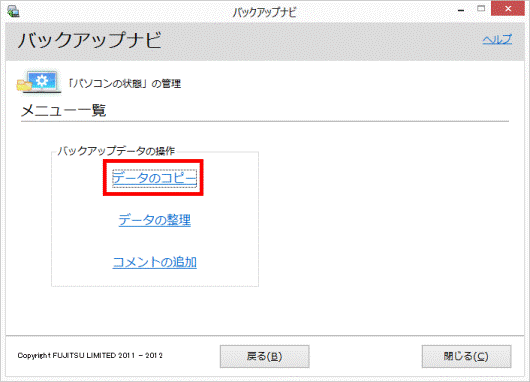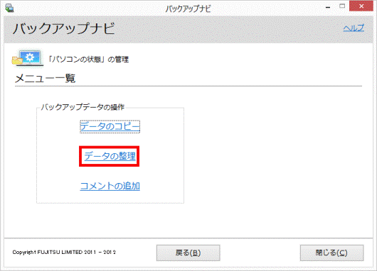 パソコンの状態の管理では、バックアップデータを、コピーしたり、整理(削除)したり、コメントを追加したりできます。