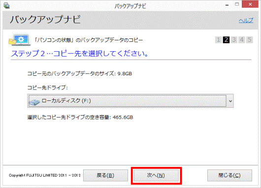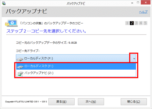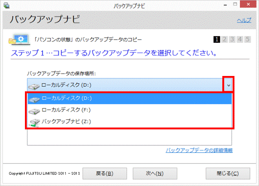 」ボタンをクリックし、表示される一覧から、バックアップデータをコピーしたいドライブをクリックします。
