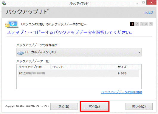 複数のバックアップデータがドライブに保存されている場合は、「バックアップデータ一覧」からコピーしたいデータをクリックします。 - 「次へ」ボタンをクリックします。