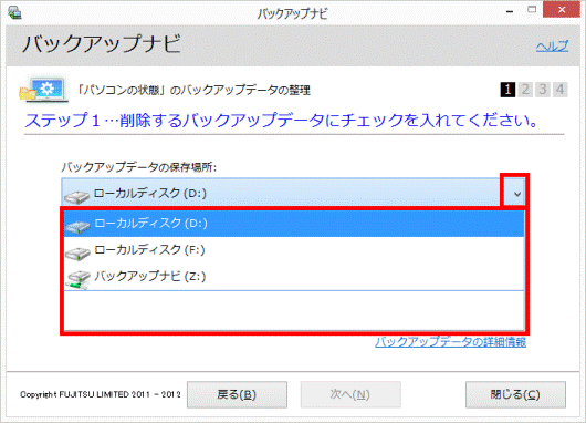 」ボタンをクリックし、表示される一覧から、削除したいバックアップデータが保存されているドライブをクリックします。