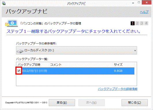 - 「ステップ1…削除するバックアップデータにチェックを入れてください。」と表示されます。