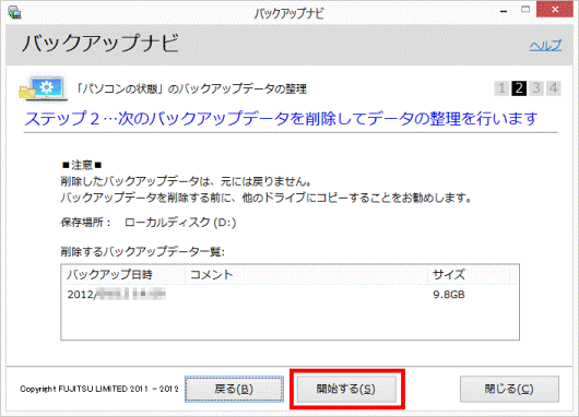 - 「ステップ2…次のバックアップデータを削除してデータの整理を行います」と表示されます。
