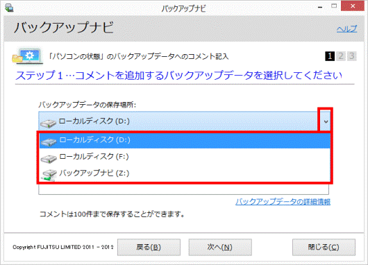 」ボタンをクリックし、表示される一覧から、コメントを追加したいバックアップデータが保存されているドライブをクリックします。