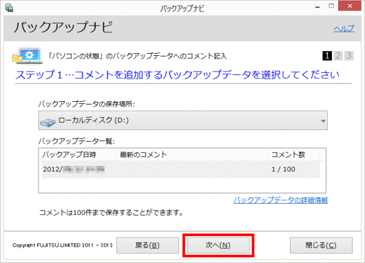 複数のバックアップデータがドライブに保存されている場合は、「バックアップデータ一覧」からコメントを追加したいデータをクリックします。 - 「次へ」ボタンをクリックします。