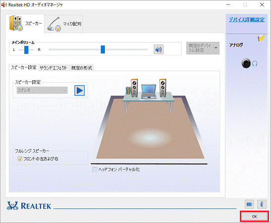 - 右下の「OK」ボタンをクリックし、「Realtek HD オーディオマネージャ」を閉じます。