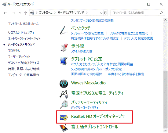 「ハードウェアとサウンド」が表示されていない場合は、「Realtek HD オーディオマネージャ」をクリックし、 手順5.へ進みます。