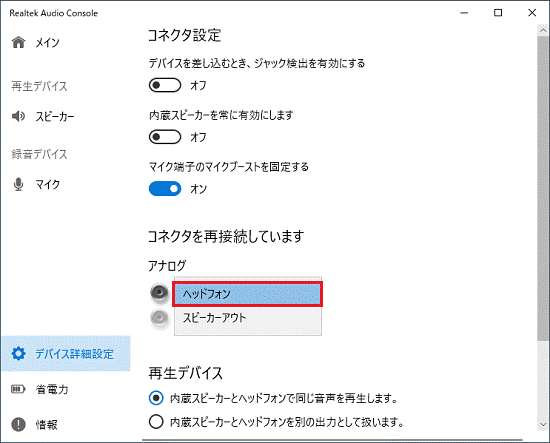 「コネクタ設定」を別の設定から「ヘッドフォン」に切り替えても音声が再生されない場合は、もう一度「再生デバイスを選択する 」をご覧になり再生デバイスの設定を確認してください。