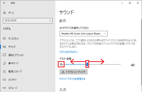 - 「マスター音量」のスピーカーのアイコンに「×」が付いている場合は、クリックしてミュートを解除します。