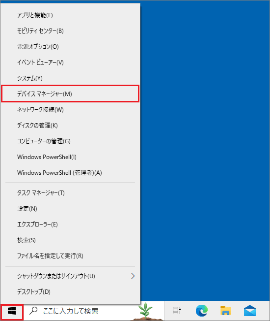 - 「スタート」ボタンを右クリックし、表示されるメニューから「デバイスマネージャー」をクリックします。