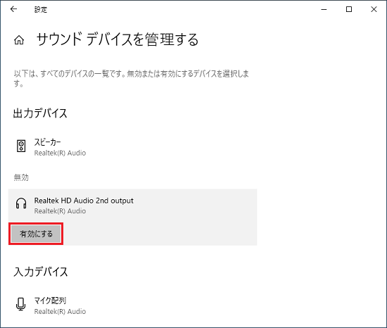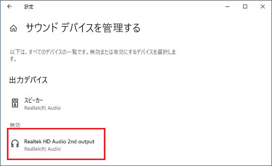 - 「出力デバイス」の「無効」に「ヘッドホン」または「Realtek HD Audio 2nd output」などヘッドホンの項目が表示されている場合はクリックします。