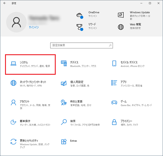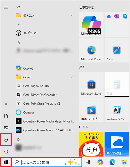 - 「スタート」ボタン→「設定」の順にクリックします。