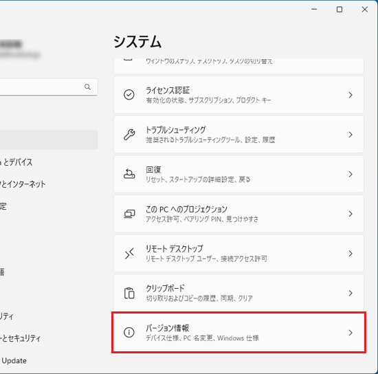 アドバイス - 画面を下にスクロールし、「バージョン情報」をクリックします。