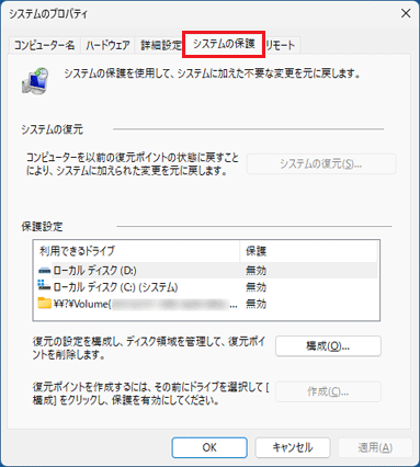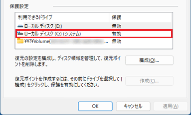 - 「システム保護対象 ローカルディスク(C:)」と表示されます。