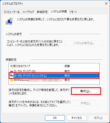 「ローカルディスク(C:)(システム)」をクリックして選択し、「構成」ボタンをクリックします。