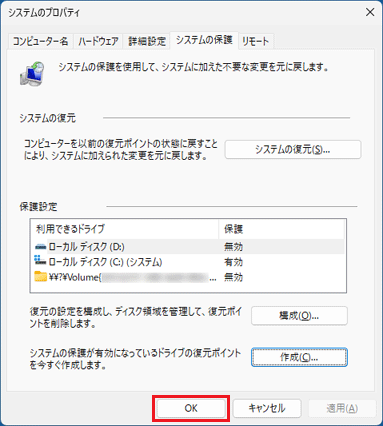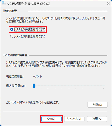 「システムの保護を有効にする」をクリックして選択し、「OK」ボタンをクリックします。
