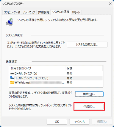 - 「ローカルディスク(C:)(システム)」が「有効」になったことを確認し、「作成」ボタンをクリックします。