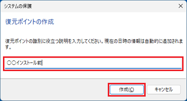 作成する復元ポイントが識別しやすい説明を入力し、「作成」ボタンをクリックします。