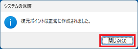 - 完了すると、「復元ポイントは正常に作成されました」と表示されます。
