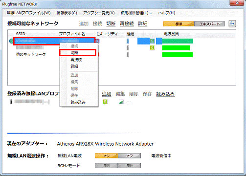 編集する場合は、その無線LANプロファイルを右クリックし、表示されるメニューから「切断」をクリックして、接続を切断してください。