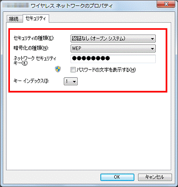 これによって、パソコンから接続する無線LANアクセスポイントを識別します。 - セキュリティの種類