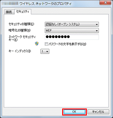 - 「OK」ボタンをクリックして、「(SSID名)ワイヤレスネットワークのプロパティ」を閉じます。