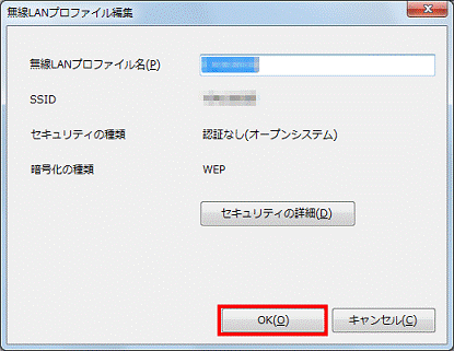 - セキュリティの種類や、ネットワークセキュリティキーなどを変更する場合は、「セキュリティの詳細」ボタンをクリックします。