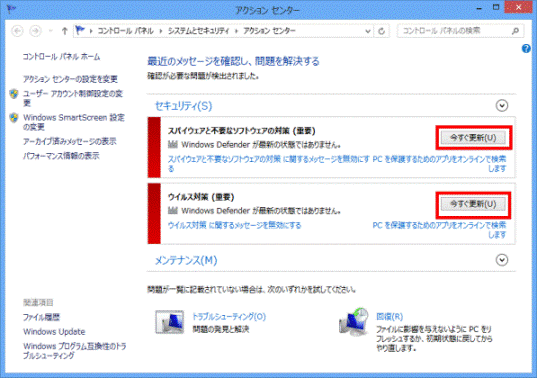 - Windows Defenderが最新の状態ではないという通知が表示されています。