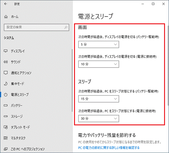 [Windows 10] 省電力状態(スリープ / 休止状態 / 画面オフ)に移行するまでの時間を変更する方法を教えてください。