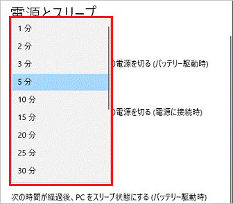 - 「次の時間が経過後、ディスプレイの電源を切る」または「次の時間が経過後、PCをスリープ状態にする」のうち、変更したい項目にある「