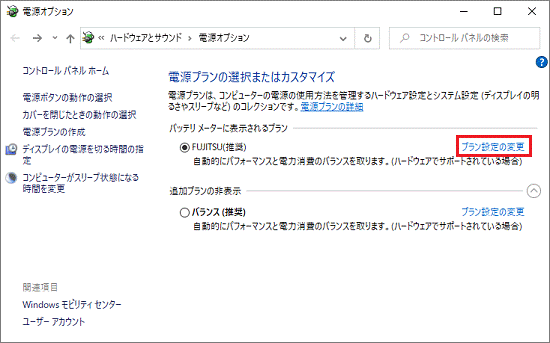 設定を変更する電源プランの「プラン設定の変更」をクリックします。