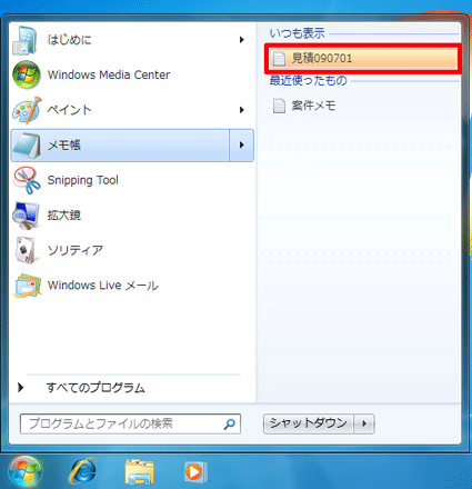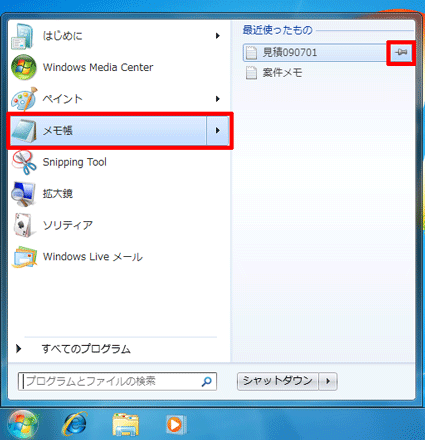 [Windows 7] 「最近使ったもの」に特定のファイルを常に表示させる方法を教えてください。