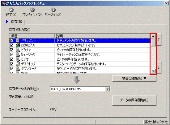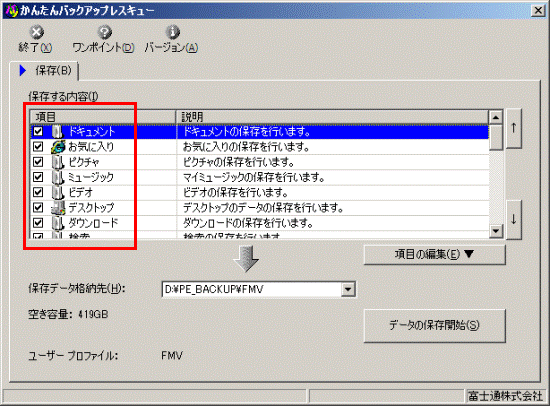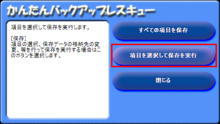 以前にかんたんバックアップレスキューで保存したことがある場合は、以前保存したデータの項目にも必ずチェックを入れて、バックアップしてください。