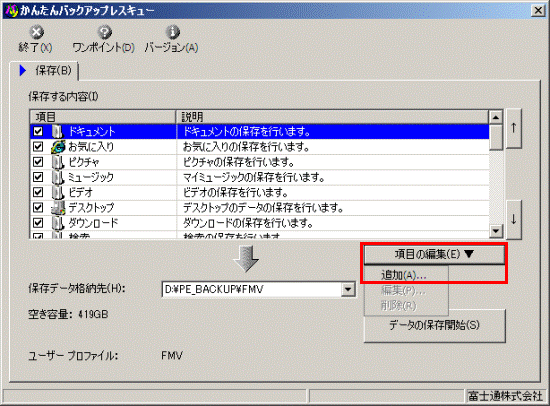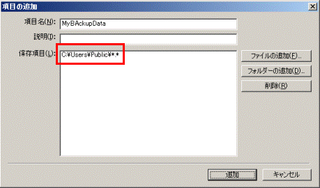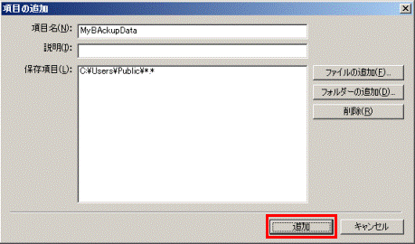 - 「保存する内容」に表示されていない項目(自分自身で作成したファイルやフォルダーなど)を、追加の項目として登録します。