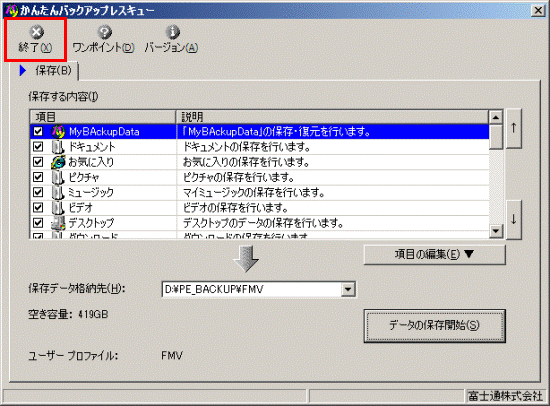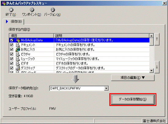 「XXXXX」には、ユーザープロファイル名(ユーザーアカウント名)が表示されます。 - 「データの保存開始」ボタンをクリックします。