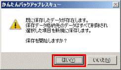 前回のバックアップデータがある場合は、「既に保存したデータが存在します。」と表示されます。