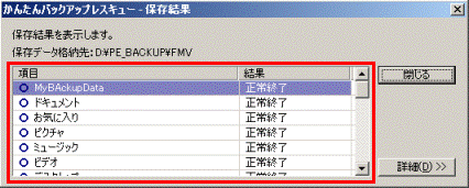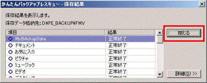 バックアップの設定をした項目によっては、長時間かかることがあります。 - バックアップが終わると、「かんたんバックアップレスキュー - 保存結果」が表示されます。