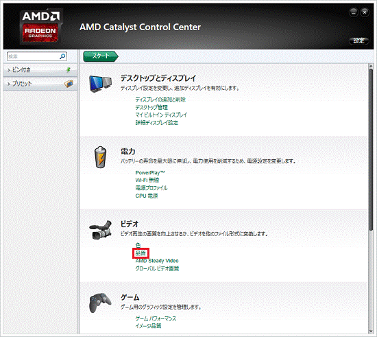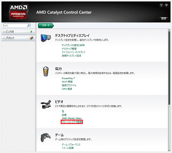 Windows 8.1で、スタート画面が表示されている場合は、「デスクトップ」タイルをクリックしてから手順1.を操作します。 - 「AMD Catalyst Control Center」が表示されます。